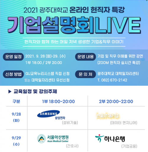 [½Åµ¿¾Æ¹æ¼Û=±èÀçÂù±âÀÚ] ±¤ÁÖ´ëÇб³(ÃÑÀå ±èÇõÁ¾) ´ëÇÐÀÏÀÚ¸®¼¾ÅÍ´Â ÇлýµéÀÇ Ãë¾÷À» µ½±â À§ÇØ ¿Â¶óÀÎ ÇöÁ÷ÀÚ Æ¯°­ ¡®±â¾÷¼³¸íȸ LIVE¡¯¸¦ Áö³­ 28ÀϺÎÅÍ ÀÌÆ²°£ °³ÃÖÇß´Ù°í ¹àÇû´Ù. À̹ø ±â¾÷¼³¸íȸ´Â »ï¼ºÀüÀÚ(¼³ºñ±â¼ú)¿Í ÆÇ±³IT´ë±â¾÷(µ¥ÀÌÅÍ ¿£Áö´Ï¾î), ¼­¿ï¾Æ¡¦