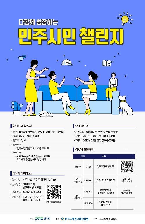 [½Åµ¿¾Æ¹æ¼Û´º½º=¹èÁöÀ± ±âÀÚ] °æ±âµµÆò»ý±³À°ÁøÈï¿øÀÌ ¹ÎÁֽùα³À° ÇÁ·Î±×·¥¿¡ Âü¿©ÇÒ ´Ù¹®È­ °¡Á¤ Çлý°ú Çкθ𸦠10¿ù 13ÀϱîÁö ¸ðÁýÇÕ´Ï´Ù. Áö¿ª°øµ¿Ã¼ ¾È¿¡¼­ ±¸¼º¿øÀ¸·Î¼­ ÇÔ²² »ì¾Æ°¡´Â ¹æ¹ýÀ» ¾Ë·ÁÁÖ´Â À̹ø ±³À°Àº »çÀü±³À° 2½Ã°£, ºñ´ë¸é Âü¿©Çü ¼ö¾÷ 6¡¦