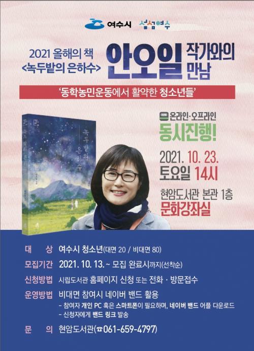 [½Åµ¿¾Æ¹æ¼Û=±è±â³² ±âÀÚ] ¿©¼ö½Ã¸³µµ¼­°üÀÌ ¿À´Â 23ÀÏ Áö¿ª û¼Ò³âµéÀ» À§ÇØ Àü¶ó³²µµ 2021 ¿ÃÇØÀÇ Ã¥(û¼Ò³â ºÎ¹®)À¸·Î ¼±Á¤µÈ ¡®³ìµÎ¹çÀÇ ÀºÇϼö¡¯ÀÇ ÀúÀÚ ¾È¿ÀÀÏ ÀÛ°¡¿ÍÀÇ ¸¸³²À» ¸¶·ÃÇß´Ù. ¡¸2021 ¿ÃÇØÀÇ Ã¥¡¹ÇÔ²² Àб⸦ À§ÇÑ ¡®ÀÛ°¡¿ÍÀÇ ¸¸³²¡¯Àº Ã¥¿¡ ´ë¡¦