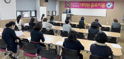 [½Åµ¿¾Æ¹æ¼Û=±èÀçÂù ±âÀÚ] È£³²´ëÇб³ »çȸÀ¶ÇÕ´ëÇпø °£È£Çаú(ÁÖÀÓ±³¼ö Á¶Àº¾Æ)´Â 10¿ù 13ÀÏ °ÇÇаü¿¡¼­ ´ëÇпø»ý ¹× ±³¼öÁøÀÌ Âü¿©ÇÑ °¡¿îµ¥ ¡®ÄÝ·ÎŰ¿ò¡¯À» ÁøÇàÇß´Ù. À̳¯ ÄÝ·ÎŰ¿ò¿¡ ÃÊûµÈ ±³¾çÇкΠ±è»ó¹Î ±³¼ö´Â °£È£Çаú ´ëÇпø»ýµéÀ» ´ë»óÀ¸·Î ¡®Àι®ÇÐÀû¡¦