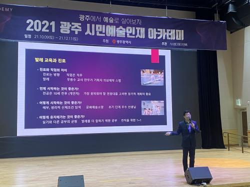 [t½Åµ¿¾Æ¹æ¼Û=±èÀçÂù ±âÀÚ] ±¤ÁÖ±¤¿ª½Ã´Â 17ÀÏ ¿ÀÀü ÀüÀϺôµù245 ´Ù¸ñÀû°­´ç¿¡¼­ ¡®±¤ÁÖ¿¡¼­ ¿¹¼ú·Î »ì¾Æº¸ÀÚ¡¯¸¦ ÁÖÁ¦·Î ±¤Áֽùο¹¼úÀÎÀç¾ÆÄ«µ¥¹Ì¸¦ °³°­Çß´Ù. ù ³¯ °­ÀÇ´Â ±è¾çÇö Àü³²´ë ±³¼ö(Àü Àü³²´ë ¹®È­Àü¹®´ëÇпøÀå)ÀÇ ±âÁ¶°­¿¬À» ½ÃÀÛÀ¸·Î ¹ÚÀçÈ« Çѱ¹¹ß·¹¡¦