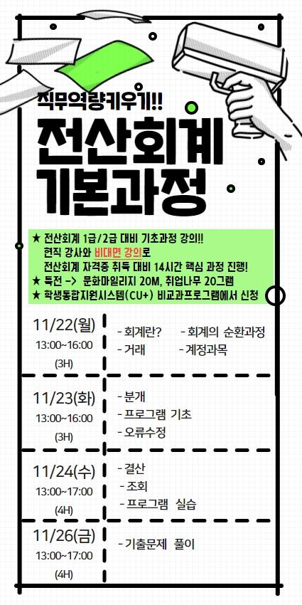[½Åµ¿¾Æ¹æ¼Û=±èÀçÂù±âÀÚ]Á¶¼±´ëÇб³ ´ëÇÐÀÏÀÚ¸®¼¾ÅͰ¡ ÇлýµéÀÇ Á÷¹« ¿ª·® °­È­¸¦ À§ÇÑ ¡®Àü»êȸ°è ±âº»°úÁ¤¡¯À» ÁøÇàÇÑ´Ù. 22ÀϺÎÅÍ 4Àϰ£ ¿î¿µµÇ´Â À̹ø °úÁ¤Àº Àü»êȸ°è 1¡¤2±Þ ´ëºñ¸¦ À§ÇÑ ±âÃʰúÁ¤ °­ÀÇ·Î Àü»êȸ°è ÀÚ°ÝÁõ Ãëµæ ´ëºñ 14½Ã°£ ÇÙ½É °úÁ¤ ÇÁ·Î±×·¥¡¦