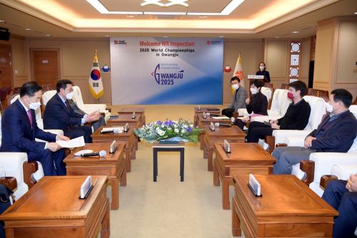[½Åµ¿¾Æ¹æ¼Û=±èÀçÂù±âÀÚ]À̿뼷 ±¤ÁÖ±¤¿ª½ÃÀåÀº 21ÀÏ ½Ãû ºñÁî´Ï½º·ë¿¡¼­ Å丶 ¿Àº£ ¼¼°è¾ç±Ã¿¬¸Í ½Ç»ç´Ü Ã¥ÀÓÀÚ¸¦ ¸¸³ª ¡®2025¼¼°è¾ç±Ã¼±¼ö±Ç´ëȸ¡¯ÀÇ ±¤ÁÖ À¯Ä¡¸¦ Èñ¸ÁÇÏ´Â ½Ã¹ÎµéÀÇ ¿­¸ÁÀ» Àü´ÞÇß´Ù. ÀÌ ½ÃÀåÀº ¡°2025³â ¼¼°è¾ç±Ã¼±¼ö±Ç´ëȸ ±¤ÁÖ À¯Ä¡¸¦ À§ÇÑ ½Ã¡¦