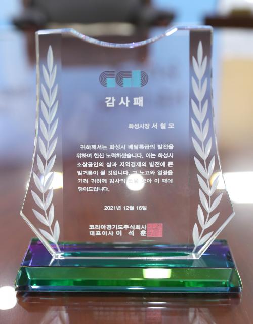 [½Åµ¿¾Æ¹æ¼Û=ÀÌÀçö ±âÀÚ] È­¼º½Ã´Â 16ÀÏ °æ±âµµ °ø°ø¹è´Þ¾Û ¡®¹è´ÞƯ±Þ¡¯ ¿ì¼öÁöÀÚü·Î ¼±Á¤µÅ °æ±âµµÁÖ½Äȸ»ç·ÎºÎÅÍ °¨»çÆÐ¸¦ ¹Þ¾Ò´Ù.  À̳¯ È­¼º½Ãû Á¢°ß½Ç¿¡¼­ ¿­¸° °¨»çÆÐ Àü´Þ½Ä¡¦