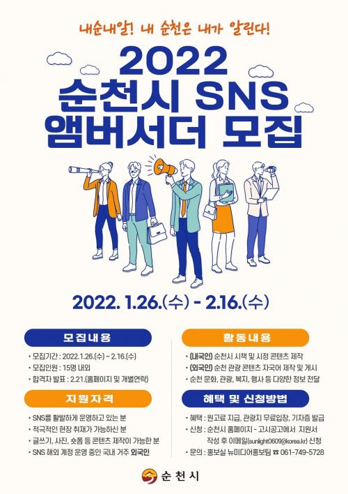 [½Åµ¿¾Æ¹æ¼Û=±è¿ëÈÆ ±âÀÚ] ¼øÃµ½Ã(½ÃÀå Çã¼®)°¡ ¿À´Â 16ÀϱîÁö ³»¡¤¿Ü±¹ÀΠû³â(¸¸ 19¼¼~39¼¼)À» ´ë»óÀ¸·Î ¡®2022 ¼øÃµ½Ã SNS ¾Ú¹ö¼­´õ¡¯¸¦ ¸ðÁýÇÑ´Ù. SNS ¾Ú¹ö¼­´õ´Â ¼øÃµÀÇ ½ÃÁ¤, ¹®È­, °ü±¤, º¹Áö µî ´Ù¾çÇÑ È«º¸ ÄÜÅÙÃ÷¸¦ ¹ß±¼Çϰí ÇöÀåÃëÀç ¹× ±â»ç Á¦ÀÛÀ» ÅëÇØ¡¦