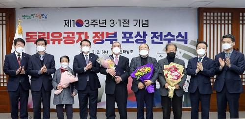 [½Åµ¿¾Æ¹æ¼Û´º½º=Á¤ÁöÀ± ±âÀÚ] Àü¶ó³²µµ´Â 2ÀÏ µµÃ» VIP½Ç¿¡¼­ Á¦103ÁÖ³â 31ÀýÀ» ¸Â¾Æ Á¤ºÎ Æ÷»ó Àü¼ö½ÄÀ» ¿­¾î µ¶¸³¿îµ¿ÀÚ±Ý ¸ð±Ý, ¼ÒÀÛ±Ç ÀÌÀü ºÎ´çÇÔ¿¡ ´ëÇÑ ½ÃÀ§ µîÀ¸·Î Åõ¿ÁµÈ 4¸í¿¡°Ô Æ÷»óÀ» Àü´ÞÇß½À´Ï´Ù. Æ÷»óÀÚ´Â °Ç±¹Æ÷Àå °í °­ÅÂ±Ô ¼±»ý, ´ëÅë·Éǥâ °í ¡¦