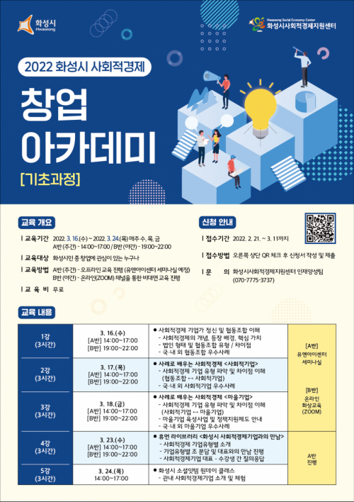 [½Åµ¿¾Æ¹æ¼Û=ÀÌÀçö ±âÀÚ] È­¼º½Ã »çȸÀû°æÁ¦Áö¿ø¼¾ÅͰ¡ ¡®2022³âµµ »çȸÀû°æÁ¦ â¾÷¾ÆÄ«µ¥¹Ì ±âÃʰúÁ¤¡¯¼ö°­»ýÀ» ¸ðÁýÇÑ´Ù. »çȸ¹®Á¦ ÇØ°áÀ» À§ÇÑ ¾ÆÀ̵ð¾î¸¦ ¹ÙÅÁÀ¸·Î â¾÷ÇÏ·Á´Â È­¼º½Ã¹ÎÀ̶ó¸é ´©±¸³ª ¹«·á·Î Âü¿© °¡´ÉÇÏ´Ù. ±³À° ½ÅûÀº 11ÀϱîÁö È­¼º½Ã »ç¡¦