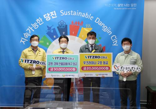[½Åµ¿¾Æ¹æ¼Û=ÀÌÀçö ±âÀÚ] ´çÁøÀ» ´ëÇ¥ÇÏ´Â ±â¾÷ÀÌÀÚ ¸®Æ¬ 1Â÷ ÀüÁö »ý»ê¾÷ü Áß ±¹³» 1À§, ¼¼°è 3À§ ±â¾÷ÀÎ ¢ßºñÃ÷·Î¼¿(´ëÇ¥ Àå½Â±¹)Àº Áö³­ 23ÀÏ ½ÃûÀ» ¹æ¹®ÇØ ´çÁø½Ãº¹ÁöÀç´Ü¿¡ °­¿ø¡¤°æºÏ »êºÒÇÇÇØ º¹±¸ ¹× ¿ìÅ©¶óÀ̳ª ³­¹Î ±¸È£¸¦ À§ÇÑ ¼º±Ý 5000¸¸ ¿øÀ» Àü´ÞÇß´Ù¡¦