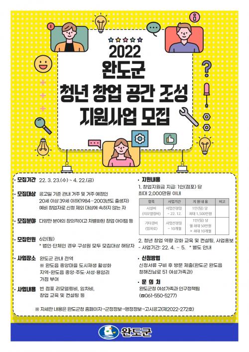 [[½Åµ¿¾Æ¹æ¼Û=À̼±Á¾ ±âÀÚ] ¿Ïµµ±ºÀº ¡®22³â Àü³² Àα¸, »õ·Î¿î Èñ¸Á ã±â ÇÁ·ÎÁ§Æ®¡¯ Àü³²µµ °ø¸ð¿¡ ¼±Á¤µÈ ¡¸¿Ïµµ±º û³â â¾÷ °ø°£ Á¶¼º Áö¿ø »ç¾÷¡¹À» ÃßÁøÇϰí, Âü¿©ÀÚ¸¦ 4¿ù 22ÀϱîÁö ¸ðÁýÇÑ´Ù. ¸ðÁý ´ë»óÀº °ø°íÀÏ ±âÁØ ¿Ïµµ±º¿¡ °ÅÁÖÇϰųª °ÅÁÖ ¿¹Á¤ÀÎ 2¡¦