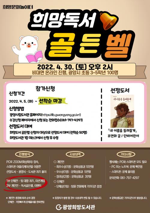 [½Åµ¿¾Æ¹æ¼Û=¹Ú±¤¿Á±âÀÚ] ±¤¾çÈñ¸Áµµ¼­°üÀº ¿À´Â 4¿ù 30ÀÏ ¿ÀÈÄ 2½Ã¿¡ ±¤¾ç½Ã ÃʵîÇб³ 3~5Çг⠾ÀÌ 100¸íÀ» ¸ðÁýÇØ ¡®Èñ¸Á µ¶¼­ °ñµçº§¡¯À» ¿Â¶óÀÎ(ZOOM)À¸·Î °³ÃÖÇÑ´Ù. À̹ø Çà»ç´Â Äڷγª19·Î Ä£±¸µé°ú ÀÚÀ¯·Î¿î ¸¸³²ÀÇ ½Ã°£ÀÌ ºÎÁ·ÇÑ ¾î¸°À̵éÀÇ ¸¶À½À» À§·ÎÇÏ¡¦