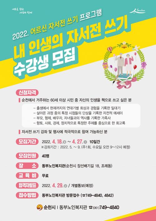[½Åµ¿¾Æ¹æ¼Û=±è¿ëÈÆ ±âÀÚ] ¼øÃµ½Ã´Â 60¼¼ ÀÌ»ó ½Ã¹ÎµéÀ» ´ë»óÀ¸·Î ¡®³» ÀλýÀÇ ÀÚ¼­Àü ¾²±â¡¯ÇÁ·Î±×·¥À» ¿î¿µÇÑ´Ù. ¡®³» ÀλýÀÇ ÀÚ¼­Àü ¾²±â¡¯ÇÁ·Î±×·¥Àº Æò¹üÇÑ ¾î¸£½ÅµéÀÌ ¹ÝÆò»ýÀ» »ì¾Æ¿À¸é¼­ ½×¾Æ¿Â ÁöÇý¿Í °æÇèµéÀ» Áö¿ª»çȸ°¡ ÇÔ²² °øÀ¯Çϱâ À§ÇØ ¸¶·ÃµÈ °úÁ¤¡¦