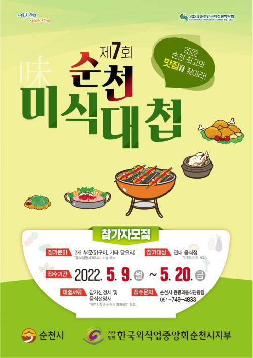 [½Åµ¿¾Æ¹æ¼Û=±è¿ëÈÆ ±âÀÚ] ¼øÃµ½Ã´Â ³²³à³ë¼Ò ¸ðµç ¿¬·ÉÃþ¿¡°Ô Àαâ ÀÖ´Â ´ßÀ» ÁÖÁ¦·Î ¿À´Â 6¿ù 17ÀϱîÁö Á¦7ȸ ¼øÃµ¹Ì½Ä´ëøÀ» °³ÃÖÇÑ´Ù. À̹ø ¹Ì½Ä´ëøÀº ´ß±¸ÀÌ¿Í ±âŸ ´ß¿ä¸® 2°³ ºÎ¹®À¸·Î ³ª´² ¼øÃµ ÃÖ°íÀÇ ´ß¿ä¸® ¸ÀÁýÀ» ¼±Á¤ÇÏ´Â À½½Ä °æ¿¬´ëȸ·Î, ÇÁ·»Â÷ÀÌÁ