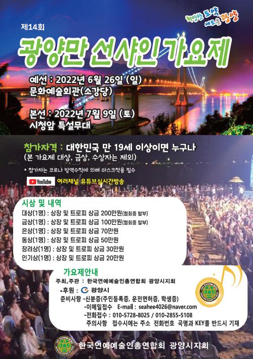 [½Åµ¿¾Æ¹æ¼Û=¹Ú±¤¿Á±âÀÚ] (»ç)Çѱ¹¿¬¿¹¿¹¼úÀÎÃÑ¿¬ÇÕȸ ±¤¾ç½ÃÁöȸ°¡ ÁÖ°üÇÏ´Â ¡®Á¦14ȸ ±¤¾ç¸¸ ¼±»þÀÎ °¡¿äÁ¦¡¯°¡ ¿À´Â 7¿ù 9ÀÏ Åä¿äÀÏ ¿ÀÈÄ 6½Ã ±¤¾ç½Ãû ¾Õ ¾ß¿Ü°ø¿¬Àå¿¡¼­ °³ÃֵȴÙ. ¿¹¼±Àº ¿À´Â 26ÀÏ ¿ÀÈÄ 1½ÃºÎÅÍ ±¤¾ç¹®È­¿¹¼úȸ°ü ¼Ò°ø¿¬Àå¿¡¼­ ÀÌ·ïÁö¸ç, ¿¹¼±¡¦