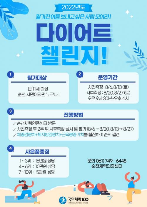 [½Åµ¿¾Æ¹æ¼Û=±è¿ëÈÆ ±âÀÚ] ¼øÃµ½Ã(½ÃÀå ³ë°ü±Ô)´Â 8¿ù º»°ÝÀûÀÎ ¿©¸§ÈÞ°¡¸¦ ¸Â¾Æ ´ÙÀÌ¾îÆ® 縰Áö¸¦ ¿î¿µÇÑ´Ù. 2022 ´ÙÀÌ¾îÆ® 縰Áö´Â ¸¸11¼¼ ÀÌ»ó ¼øÃµ½Ã¹Î ´©±¸³ª Âü¿©°¡´ÉÇÏ´Ù. ¸ðÁý±â°£Àº µû·Î ¾øÀ¸¸ç, »çÀü°Ë»çÀÏÀÎ 8¿ù 6ÀÏ(Åä)°ú 13ÀÏ(Åä)¿¡ ¼øÃµÃ¼·ÂÀÎÁõ¼¾¡¦