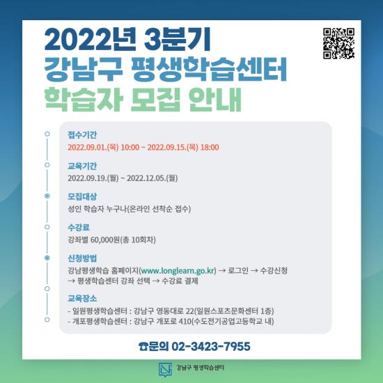 [½Åµ¿¾Æ¹æ¼Û=À̽ŵ¿±âÀÚ] °­³²±¸(±¸Ã»Àå Á¶¼º¸í)°¡ 9¿ù °³°­ÇÏ´Â ¡®2022³â 3ºÐ±â °­³²±¸ Æò»ýÇнÀ¼¾ÅÍ ±³À° ÇÁ·Î±×·¥¡¯¿¡ Âü¿©ÇÒ ¼ºÀÎ ÇнÀÀÚ¸¦ ´ÙÀ½ ´Þ 1ÀϺÎÅÍ 15ÀϱîÁö °­³²Æò»ýÇнÀ ȨÆäÀÌÁö¸¦ ÅëÇØ ¸ðÁýÇÑ´Ù. °­³²±¸ Æò»ýÇнÀ¼¾ÅÍ´Â Áö³­ 1ºÐ±â¿Í 2ºÐ±â¿¡ ¾à 20¡¦