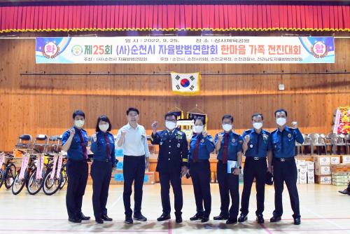 [½Åµ¿¾Æ¹æ¼Û=¹Ú±¤¿Á±âÀÚ] ¼øÃµ°æÂû¼­(¼­Àå ±èÁßÈ£)´Â Áö³­ 25ÀÏ ¼øÃµ½Ã ÀÚÀ²¹æ¹ü¿¬ÇÕȸ ÇѸ¶À½ °¡Á· ÀüÁø´ëȸ¿¡ Âü¼®ÇØ Áö¿ªº° ÀÚÀ²¹æ¹ü´ë¿øµéÀ» °Ý·ÁÇß´Ù. Áö¿ª»çȸ ¾ÈÀüÀ» ÁöŰ°í ¹üÁ˸¦ ¸·±â À§ÇØ ºÀ»çÇÏ´Â ÀÚÀ²¹æ¹ü´ë¿øµéÀ» À§ÇØ ¸¶·ÃµÈ ÀÌ ³¯ Çà»ç´Â ½ÄÀü Çà»ç¡¦