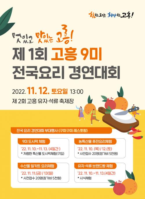 [½Åµ¿¾Æ¹æ¼Û=¹Ú±¤¿Á±âÀÚ] °íÈﱺ(±º¼ö °ø¿µ¹Î)Àº °íÈïÀÇ ¸ÀÀ» Àü±¹¿¡ ¾Ë¸®±â À§ÇØ ¿À´Â 11¿ù 12ÀÏ ¡®Á¦1ȸ °íÈï 9Ú« Àü±¹¿ä¸® °æ¿¬´ëȸ¡¯¸¦ °³ÃÖÇÑ´Ù°í ¹àÇû´Ù. À̹ø °æ¿¬´ëȸ´Â °íÈﱺ¿¡¼­ óÀ½ °³ÃֵǴ ´ë±Ô¸ð ¿ä¸®Çà»ç·Î ûÁ¤ÇÏ°í ¿ì¼öÇÑ Áö¿ªÀÇ ³ó¼öƯ»ê¹°À» À硦