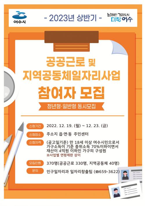[½Åµ¿¾Æ¹æ¼Û=±è±â³² ±âÀÚ] ¿©¼ö½Ã(½ÃÀå Á¤±â¸í)°¡ ¡®2023³â »ó¹Ý±â °ø°øÀÏÀÚ¸®»ç¾÷¡¯ Âü¿©ÀÚ¸¦ ¸ðÁýÇÑ´Ù. ¸ðÁý ÀοøÀº °ø°ø±Ù·Î»ç¾÷ 330¸í, Áö¿ª°øµ¿Ã¼ ÀÏÀÚ¸®»ç¾÷ 40¸íÀ¸·Î ÃÑ 370¸íÀÌ´Ù. ½Åû ´ë»óÀº ¿©¼ö½Ã¿¡ °ÅÁÖÇÏ´Â ¸¸ 18¼¼ ÀÌ»ó ±Ù·Î´É·ÂÀÚ·Î, ±âÁØÁßÀ§¡¦