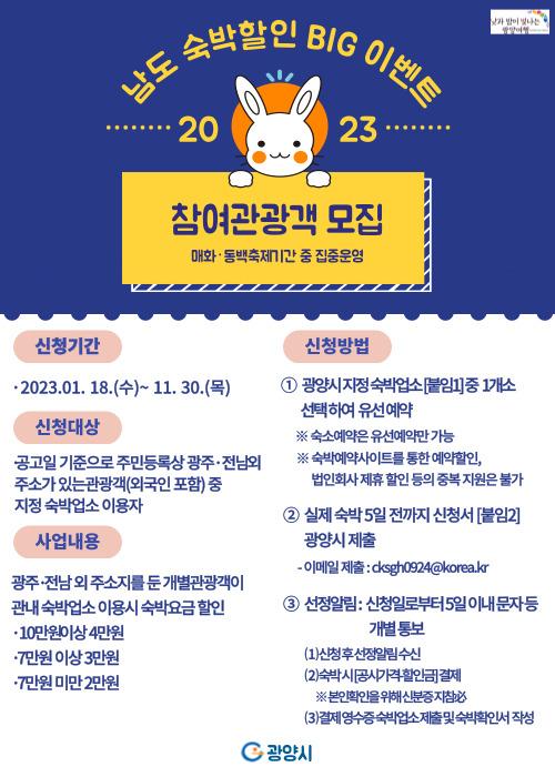 [½Åµ¿¾Æ¹æ¼Û= ¹Ú±¤¿Á ±âÀÚ] ±¤¾ç½Ã°¡ 2022~2023 Àü¶ó³²µµ ¹æ¹®ÀÇ ÇØ ÀÏȯÀ¸·Î ½Ç½ÃÇϴ¡¸³²µµ ¼÷¹ÚÇÒÀÎ BIG À̺¥Æ®¡¹¿¡ Âü¿©ÇÒ °ü±¤°´À» ¸ðÁýÇÑ´Ù°í ¹àÇû´Ù. ³²µµ ¼÷¹ÚÇÒÀÎ BIG À̺¥Æ®´Â °³º°°ü±¤°´ÀÌ °ü³» ¼÷¹Ú¾÷¼Ò ÀÌ¿ë ½Ã ¼÷¹Ú·á¸¦ ÇÒÀÎÇØ ÁÖ´Â »ç¾÷À¸·Î ¿À´Â 11¿ù¡¦