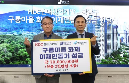 [½Åµ¿¾Æ¹æ¼Û °­³²=À̽ŵ¿±âÀÚ]°­³²±¸(±¸Ã»Àå Á¶¼º¸í)°¡ 27ÀÏ °­³²º¹ÁöÀç´Ü¿¡¼­ HDCÇö´ë»ê¾÷°³¹ß°ú ÇÔ²² ±¸·æ¸¶À» È­Àç ÀÌÀç¹Î µ½±â ¼º±Ý Àü´Þ½ÄÀ» °³ÃÖÇß´Ù. À̳¯ HDCÇö´ë»ê¾÷°³¹ßÀº ±¸·æ¸¶À» È­Àç ÇÇÇØ º¹±¸ Áö¿øÀ» À§ÇØ 2õ¸¸¿ø »ó´çÀÇ »ýÇÊǰÀ» Æ÷ÇÔÇØ 7õ¸¸¿øÀ»¡¦