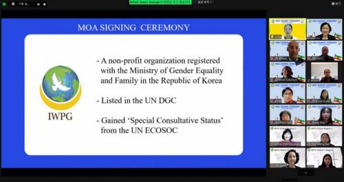 [½Åµ¿¾Æ¹æ¼Û=±è¿ëÈÆ ±âÀÚ] (»ç)¼¼°è¿©¼ºÆòÈ­±×·ì ±Û·Î¹ú 2±¹(IWPG, ±¹Àå À̼­¿¬)´Â ¿¡Æ¼¿ÀÇÇ¾Æ ¡®ÆòÈ­±â±¸°³¹ß(DPO, ´ëÇ¥¿¡¼ÎÅõ ¸æ±â½ºÅõ Æ¿¶óÈÆ)¡¯°ú ÆòÈ­»ç¾÷ ½ÇÇöÀ» À§ÇÑ MOA ü°á½ÄÀ» ¿Â¶óÀÎÀ¸·Î ÁøÇàÇß´Ù. ÆòÈ­±â±¸°³¹ß(DPO)Àº ÀÎÁ¾, Á¾±³, ¹®È­¸¦ ³Ñ¾î »ç¡¦