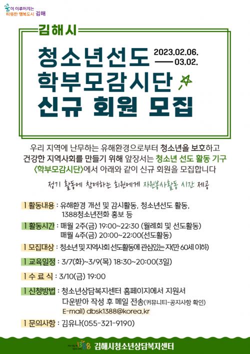 [½Åµ¿¾Æ¹æ¼Û´º½º=½Åµ¿È£±âÀÚ] ±èÇØ½Ã û¼Ò³â»ó´ãº¹Áö¼¾ÅÍ¿¡¼­ Áö¿ª»çȸ ³» û¼Ò³â ¾ÈÀüÁöÅ´ÀÌ ¡®±èÇØ½Ã û¼Ò³â¼±µµ Çкθ𰨽ôܡ¯ ½Å±Ô ȸ¿øÀ» ¸ðÁýÇÕ´Ï´Ù. ¸ðÁý´ë»óÀº ¸¸ 60¼¼ ÀÌÇÏÀÇ Ã»¼Ò³â ¹× Áö¿ª»çȸ ¼±µµÈ°µ¿¿¡ °ü½É ÀÖ´Â ½Ã¹ÎÀÔ´Ï´Ù. ¸ðÁý±â°£Àº 2¿ù¡¦