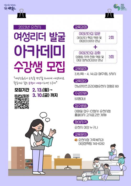 [½Åµ¿¾Æ¹æ¼Û=±è¿ëÈÆ ±âÀÚ] ¼øÃµ½Ã(½ÃÀå ³ë°ü±Ô)´Â ¿©¼ºÄ£È­µµ½Ã ¼øÃµÀ» °ßÀÎÇÒ Â÷¼¼´ë ¿©¼º¸®´õ ¹ß±¼ ¾ÆÄ«µ¥¹Ì ±³À° ¼ö°­»ýÀ» ¿À´Â 13ÀϺÎÅÍ ´ÙÀ½ ´Þ 10ÀϱîÁö ¸ðÁýÇÑ´Ù°í ¹àÇû´Ù. À̹ø ¾ÆÄ«µ¥¹Ì´Â ¿©¼ºÀÇ »çȸ, °æÁ¦Âü¿© È®´ë¸¦ À§ÇÑ ¿©¼º¸®´õ½ÊÀ» °­È­ÇÏ´Â ±³À°À¸¡¦
