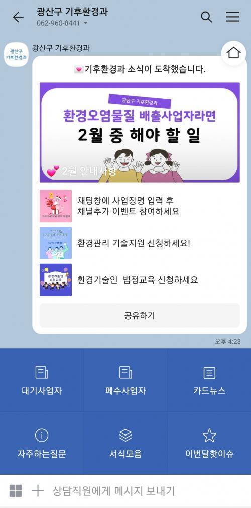 [½Åµ¿¾Æ¹æ¼Û=±èÀçÂù±âÀÚ]±¤ÁÖ ±¤»ê±¸(±¸Ã»Àå ¹Úº´±Ô)´Â °ü³» »ç¾÷ÀåÀÇ È¿À²ÀûÀΠȯ°æ¿À¿°¹°Áú°ü¸®¸¦ Áö¿øÇϱâ À§ÇØ ¡®±¤»ê±¸ ±âÈÄȯ°æ°ú¡¯ ¼ÒÅë ⱸ(īī¿ÀÅå ä³Î)¸¦ ¿î¿µÇÑ´Ù°í ¹àÇû´Ù. À̹ø ¼ÒÅë ⱸ ¿î¿µÀº ȹÀÏÀûÀÎ ÁöµµÁ¡°Ë ¹æ½Ä¿¡¼­ ¹þ¾î³ª ÇÊ¿äÇÑ Á¤º¸¸¦ Á¦¡¦