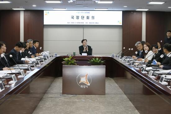 [½Åµ¿¾Æ¹æ¼Û=ÀÌÀçö ±âÀÚ] È­¼º½Ã°¡ 14ÀÏ, »óȲ½Ç¿¡¼­ ½Ç¡¤±¹Àå ÀÌ»ó °£ºÎ, ÁÖ¿ä ºÎ¼­Àå ¹× °ø°ø±â°üÀå µî 60¿©¸íÀÌ Âü¼®ÇÑ °¡¿îµ¥ ±¹Àå´ÜȸÀǸ¦ ¿­°í û·Å½Çõ ÀÇÁö¸¦ ´ÙÁ³´Ù. ¾Õ¼­ ¿Ã ÃÊ ¡®½ÇõÇϴ û·Å¹®È­, Ŭ¸°È­¼º ±¸Çö¡¯À» ¸ñÇ¥·Î ¡®2023³â û·Åµµ Çâ»ó Á¾ÇÕ¡¦