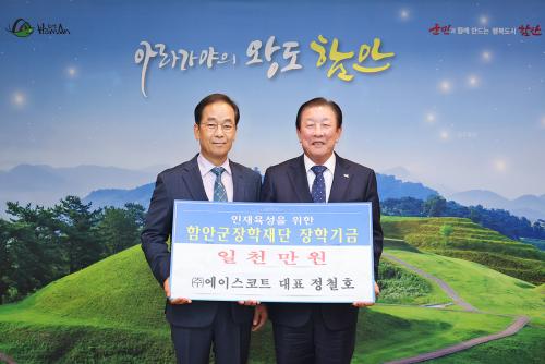 [½Åµ¿¾Æ¹æ¼Û ÇÔ¾È=À̽ŵ¿±âÀÚ]ÇԾȱºÀåÇÐÀç´ÜÀº 13ÀÏ ¿ÀÀü 11½Ã ¢ß¿¡À̽ºÄÚÆ®(´ëÇ¥ Á¤Ã¶È£)¿¡¼­ ÀåÇбâ±Ý 1000¸¸ ¿øÀ» ±âŹÇß´Ù°í ¹àÇû´Ù. À̳¯ ±âŹ½Ä¿¡´Â Á¤Ã¶È£ ´ëÇ¥°¡ Âü¼®ÇØ ÀåÇбâ±ÝÀ» Àü´ÞÇß´Ù. Á¤Ã¶È£ ´ëÇ¥´Â ¡°ÇÔ¾ÈÁö¿ª ÇлýµéÀÌ ²ÞÀ» Ű¿ì´Âµ¥ Á¶±ÝÀ̳ª¸¶¡¦