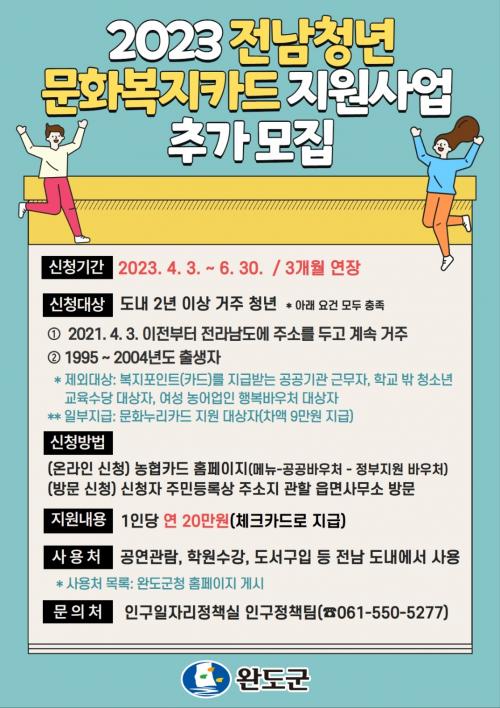 [½Åµ¿¾Æ¹æ¼Û=À̼±Á¾ ±âÀÚ] ¿Ïµµ±ºÀº û³âµéÀÇ ¹®È­»ýȰ ÇâÀ¯ ¹× Àڱ⠰è¹ß ±âȸ Á¦°øÀ» À§ÇØ Ã»³â¿¡°Ô ¿¬ 20¸¸ ¿øÀÇ ¹®È­º¹Áöºñ¸¦ Áö¿øÇÏ´Â ¡®Àü³² û³â ¹®È­º¹Áö Ä«µå Áö¿ø »ç¾÷¡¯ ´ë»óÀÚ¸¦ 6¿ù 30ÀϱîÁö Ãß°¡ ¸ðÁýÇÑ´Ù. Áö¿ø ´ë»óÀº 2021³â 4¿ù 3ÀÏ ÀÌÀüºÎÅÍ Àü¡¦