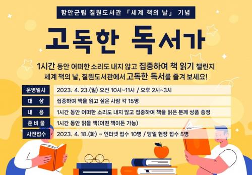 [½Åµ¿¾Æ¹æ¼Û ÇÔ¾È=À̽ŵ¿±âÀÚ]ÇԾȱº¸³ Ä¥¿øµµ¼­°üÀº 4¿ù 23ÀÏ ¼¼°è Ã¥ÀÇ ³¯À» ¸ÂÀÌÇØ ¼¼°è Ã¥ÀÇ ³¯ÀÎ ¿À´Â 23ÀÏ¿¡ ¡®°íµ¶ÇÑ µ¶¼­°¡¡¯ ÇÁ·Î±×·¥À» ¿î¿µÇÑ´Ù°í ¹àÇû´Ù. ¡®°íµ¶ÇÑ µ¶¼­°¡¡¯´Â ÁÖ¾îÁø 1½Ã°£ µ¿¾È Á¶¿ëÈ÷ Ã¥À» Á¤µ¶ÇÏ¸é ¼ÒÁ¤ÀÇ »óǰÀ» ÁÖ´Â À̺¥Æ®·Î, 4¡¦