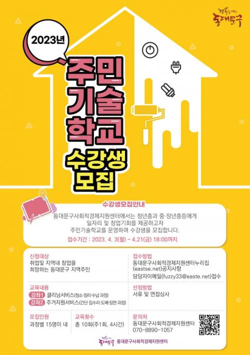 [½Åµ¿¾Æ¹æ¼Û µ¿´ë¹®=À̽ŵ¿±âÀÚ] µ¿´ë¹®±¸Ã»Àå ÀÌÇÊÇüÀº ¿À´Â 5¿ùºÎÅÍ µ¿´ë¹®±¸»çȸÀû°æÁ¦Áö¿ø¼¾ÅÍ(´ëÇ¥ ÃÖ±Ù¿µ)¸¦ ÅëÇØ ÁֹεéÀ» ´ë»óÀ¸·Î »ýȰ ¼ö¿ä ±â¹Ý ±â¼ú±³À°À» ½ÃÇàÇÏ´Â ¡®2023 Áֹαâ¼úÇб³(3±â)¡¯¸¦ ¿î¿µÇÑ´Ù. Áֹαâ¼úÇб³´Â ÁÖ¹ÎÀÇ Ãë¾÷ ¹× â¾÷À» Áö¿øÇÏ¡¦