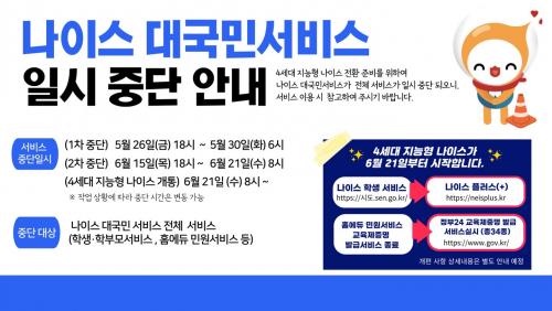 [½Åµ¿¾Æ¹æ¼Û Àü³²=À̽ŵ¿±âÀÚ]Àü¶ó³²µµ±³À°Ã»ÀÌ 4¼¼´ë Áö´ÉÇü ³ªÀ̽º ÀÚ·á À̰ü ÀÛ¾÷ µîÀ¸·Î ±³À°Á¦Áõ¸í ¹ß±ÞÀ» 5¿ù 26ÀÏ(±Ý) ¿ÀÈÄ 6½ÃºÎÅÍ 5¿ù 30ÀÏ(È­) ¿ÀÀü 6½Ã±îÁö, 6¿ù 15ÀÏ(¸ñ) ¿ÀÈÄ 6½ÃºÎÅÍ 6¿ù 21ÀÏ(¼ö) ¿ÀÀü 8½Ã±îÁö µÎ Â÷·Ê Áß´ÜÇÑ´Ù. À̹ø ÀϽà Áß´ÜÀº ±³¡¦