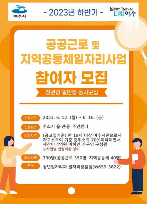 [½Åµ¿¾Æ¹æ¼Û=±è±â³² ±âÀÚ] ¿©¼ö½Ã(½ÃÀå Á¤±â¸í)°¡ ¿À´Â 12~16ÀϱîÁö ÇϹݱ⠰ø°øÀÏÀÚ¸®»ç¾÷ Âü¿©ÀÚ 390¸íÀ» À» ¸ðÁýÇÑ´Ù. À̹ø ¸ðÁý ÀοøÀº °ø°ø±Ù·Î»ç¾÷ 350¸í, Áö¿ª°øµ¿Ã¼ ÀÏÀÚ¸®»ç¾÷ 40¸íÀÌ´Ù. ½Åû´ë»óÀº ¿©¼ö¿¡ °ÅÁÖÇÏ´Â ¸¸ 18¼¼ ÀÌ»ó ±Ù·Î´É·ÂÀÚ·Î, ±â¡¦