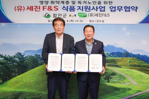 [ÇÔ¾È ½Åµ¿¾Æ¹æ¼Û=À̽ŵ¿±âÀÚ]ÇԾȱºÀº 8ÀÏ (À¯)¼¼ÁøF&S(´ëÇ¥ Àü¿µ¹«)¿Í ¡®¿µ¾ç Ãë¾à°èÃþ ¹× µ¶°Å³ëÀÎÀ» À§ÇÑ ½Äǰ Áö¿ø Çù¾à¡¯À» ¸Î¾ú´Ù°í ¹àÇû´Ù. À̹ø Çù¾àÀ¸·Î (À¯)¼¼ÁøF&S¿¡¼­´Â ¸Å³â 5000¸¸ ¿ø »ó´çÀÇ ½ÄǰÀ» ±âÅ¹ÇØ °ü³» ¿µ¾ç Ãë¾à°èÃþ ¹× µ¶°Å³ëÀο¡°Ô Áö¿ø¡¦