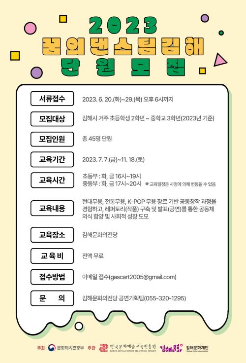 [½Åµ¿¾Æ¹æ¼Û´º½º=ÃÖ¼ÛÈ­±âÀÚ] (Àç)±èÇØ¹®È­Àç´Ü ±èÇØ¹®È­ÀÇÀü´çÀº ¿À´Â 6¿ù 29ÀÏ(¸ñ)±îÁö ¡®2023 ²ÞÀÇ ´í½ºÆÀ ±èÇØ¡¯ ½Å±Ô ´Ü¿øÀ» ¸ðÁýÇÑ´Ù. ¡®2023 ²ÞÀÇ ´í½ºÆÀ ±èÇØ¡¯´Â ¹®È­Ã¼À°°ü±¤ºÎ°¡ ÁÖÃÖÇϰí Çѱ¹¹®È­¿¹¼ú±³À°ÁøÈï¿ø°ú (Àç)±èÇØ¹®È­Àç´ÜÀÌ ÁÖ°üÇÏ´Â ¹®È­¿¹¡¦