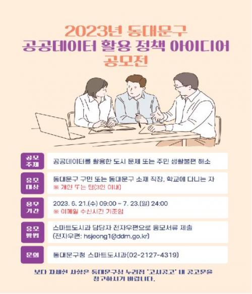 [½Åµ¿¾Æ¹æ¼Û µ¿´ë¹®=À̽ŵ¿±âÀÚ]µ¿´ë¹®±¸°¡ °ø°øµ¥ÀÌÅÍ È°¿ë ¹®È­¸¦ È®»ê½Ã۰í ÁֹεéÀÇ Á¤Ã¥ ¾ÆÀ̵ð¾î ¹ß±¼À» ÅëÇØ µ¥ÀÌÅÍ ±â¹Ý ÇàÁ¤À» ±¸ÇöÇϰíÀÚ ¡°2023³â µ¿´ë¹®±¸ °ø°øµ¥ÀÌÅÍ È°¿ë Á¤Ã¥ ¾ÆÀ̵ð¾î °ø¸ðÀü¡±À» °³ÃÖÇÑ´Ù. °ø¸ð ÁÖÁ¦´Â °ø°øµ¥ÀÌÅ͸¦ Ȱ¿ëÇÑ µµ½Ã ¹®¡¦