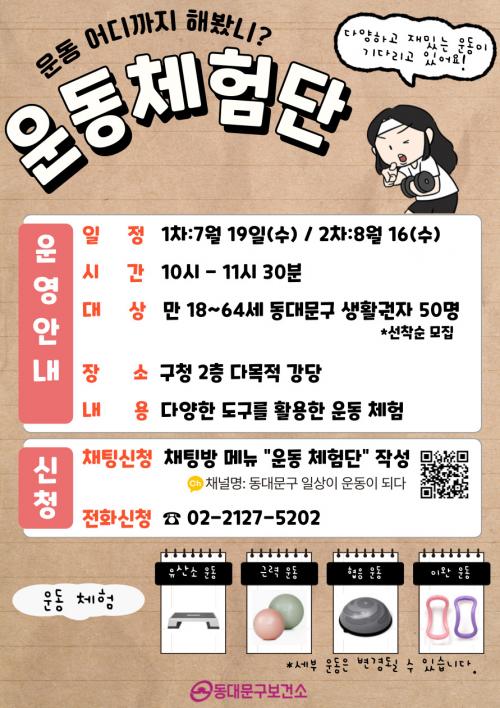 [½Åµ¿¾Æ¹æ¼Û µ¿´ë¹®=À̽ŵ¿±âÀÚ]µ¿´ë¹®±¸(±¸Ã»Àå ÀÌÇÊÇü)´Â ±¸¹ÎÀÇ ºñ¸¸ °³¼± ¹× ½ÅüȰµ¿ Ȱ¼ºÈ­¸¦ À§ÇØ ¸¸ 18~64¼¼ µ¿´ë¹®±¸»ýȰ±ÇÀÚ(±¸¹Î, Á÷ÀåÀÎ, Çлý)¸¦ ´ë»óÀ¸·Î ¡®¿îµ¿ üÇè´Ü¡¯À» ¸ðÁý ¹× ¿î¿µÇÑ´Ù °í ¹àÇû´Ù. 7¿ù 19ÀÏ(¼ö), 8¿ù 16ÀÏ(¼ö) ÃÑ 2ȸ¿¡ °ÉÃÄ ±¸¡¦