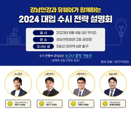 [½Åµ¿¾Æ¹æ¼Û °­³²=À̽ŵ¿±âÀÚ]°­³²±¸°¡ ´ëÀÔ ¼ö½Ã Áö¿øÀ» ¾ÕµÎ°í ÀÖ´Â ¼öÇè»ý ¹× Çкθð 500¿©¸íÀ» ´ë»óÀ¸·Î ¿À´Â 4ÀÏ Àú³á 7½Ã °­³²±¸¹Îȸ°ü¿¡¼­ ¡®°­³²Àΰ­ 2024 ´ëÀÔ ¼ö½Ã Àü·« ¼³¸íȸ¡¯¸¦ °³ÃÖÇÑ´Ù. ±×µ¿¾È ¿Â¶óÀÎ ÀԽü³¸íȸ¸¦ ÅëÇØ ÀԽà Á¤º¸¸¦ Á¦°øÇØ ¿Â °­³²¡¦