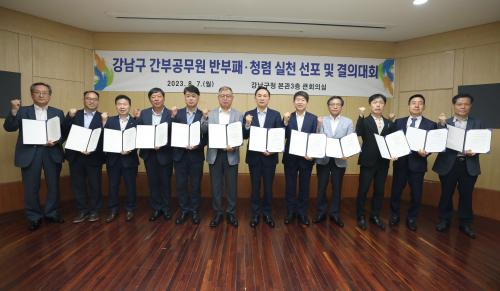 [½Åµ¿¾Æ¹æ¼Û °­³²=À̽ŵ¿±âÀÚ]°­³²±¸°¡ 7ÀÏ ±¸Ã»ÀåÀ» ºñ·ÔÇÑ °£ºÎ °ø¹«¿ø°ú °øÁ÷À¯°ü´Üü(°­³²±¸µµ½Ã°ü¸®°ø´Ü, °­³²¹®È­Àç´Ü, °­³²º¹ÁöÀç´Ü) °£ºÎ µî 82¸íÀÌ ¡®¹ÝºÎÆÐ・û·Å ½Çõ ¼±Æ÷ ¹× °áÀÇ ´ëȸ¡¯¸¦ °³ÃÖÇß´Ù. À̹ø °áÀÇ ´ëȸ´Â Àü °£ºÎ°¡ ¸ÕÀú ³ª¼­ û·Å ¡¦