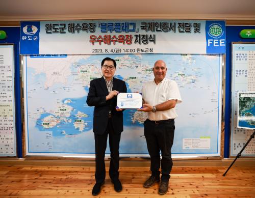 [½Åµ¿¾Æ¹æ¼Û=À̼±Á¾ ±âÀÚ] ¿Ïµµ±ºÀÌ Áö³­ 4ÀÏ È¯°æ±³À°Àç´Ü(FEE)À¸·ÎºÎÅÍ ½ÅÁö ¸í»ç½Ê¸® ÇØ¼ö¿åÀå°ú º¸±æ ¿¹¼Û ÇØ¼ö¿åÀå, û»ê ½ÅÈï ÇØ¼ö¿åÀå¿¡ ´ëÇÑ ¡®ºí·çÇ÷¡±×¡¯ ÀÎÁõ¼­¸¦ Àü´Þ¹Þ¾Ò´Ù. À̳¯ Àü´Þ½Ä¿¡´Â ȯ°æ±³À°Àç´Ü ±¹Á¦º»ºÎ CEOÀÎ ´Ù´Ï¿¤ ½¦ÆÛ°¡ Á÷Á¢ Âü¼®¡¦