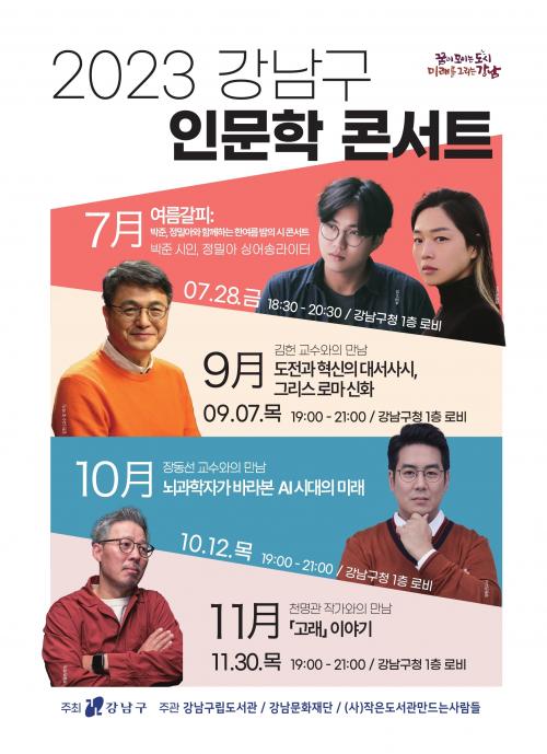 [½Åµ¿¾Æ¹æ¼Û °­³²=À̽ŵ¿±âÀÚ]°­³²±¸°¡ 9¿ù 7ÀÏ Àú³á 7½Ã ±¸Ã» 1Ãþ ·Îºñ¿¡¼­ ±èÇå ±³¼ö¸¦ ÃÊÃ»ÇØ Àι®ÇÐ Äܼ­Æ® ¡®µµÀü°ú Çõ½ÅÀÇ ´ë¼­»ç½Ã, ±×¸®½º ·Î¸¶ ½ÅÈ­¡¯¸¦ °­¿¬ÇÑ´Ù. Àι®ÇÐÀÇ ´ëÁßÈ­¸¦ À§ÇØ °¢°è°¢ÃþÀÇ ¸í»ç, ÀÛ°¡, ¿¹¼ú°¡¸¦ ÃÊÃ»ÇØ À̾߱⸦ ³ª´©´Â °­³²±¸ ¡¦