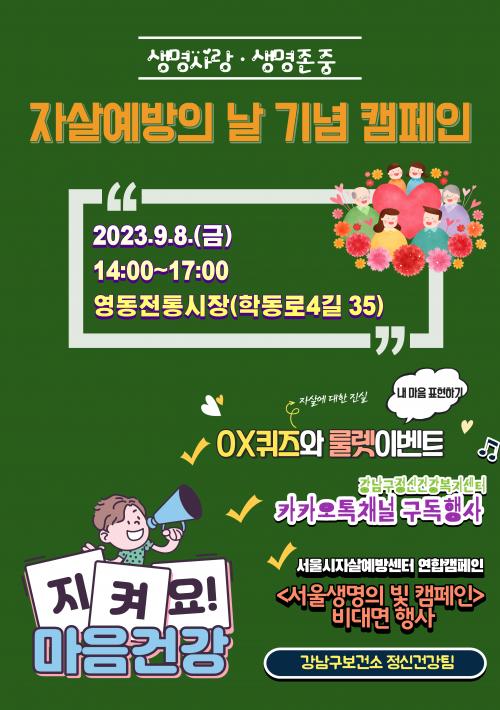 [½Åµ¿¾Æ¹æ¼Û °­³²=À̽ŵ¿±âÀÚ]°­³²±¸°¡ ¼¼°è Àڻ쿹¹æÀÇ ³¯(9¿ù 10ÀÏ)À» ¸Â¾Æ Àڻ쿹¹æ¿¡ ´ëÇÑ °ü½É °íÃë¿Í »ý¸íÁ¸Áß ¹®È­ È®»êÀ» À§ÇØ 9¿ù ÇÑ ´Þ°£ 3Â÷·Ê¿¡ °ÉÃÄ ¡®»ý¸í»ç¶û, »ý¸íÁ¸Áß¡¯ Ä·ÆäÀÎÀ» ½Ç½ÃÇÑ´Ù. ¼¼°èº¸°Ç±â±¸(WHO)¿Í ±¹Á¦Àڻ쿹¹æÇùȸ(IASP)°¡ ÁöÁ¤ÇÑ ¡¦