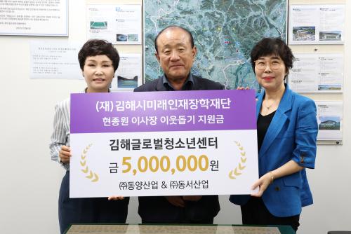 [½Åµ¿¾Æ¹æ¼Û´º½º=ÀÌÁ¶Àº±âÀÚ] ±èÇØ½Ã¹Ì·¡ÀÎÀçÀåÇÐÀç´Ü(ÀÌ»çÀå ÇöÁ¾¿ø)Àº 21ÀÏ ÇöÁ¾¿ø ÀÌ»çÀåÀÌ Ãß¼®À» ¸Â¾Æ ±èÇØ±Û·Î¹úû¼Ò³â¼¾ÅÍ¿Í ¿ÃŰÁƮ¶ó¿¡ °¢°¢ 500¸¸¿ø¾¿ °³ÀÎ ±âºÎÇß´Ù°í ¹àÇû´Ù. ±èÇØ½Ã Áø¿µÀ¾¿¡ À§Ä¡ÇÑ ±èÇØ±Û·Î¹úû¼Ò³â¼¾ÅÍ(¼¾ÅÍÀå ¼ÕÀº¼÷)´Â ÁßµµÀÔ±¹¡¦