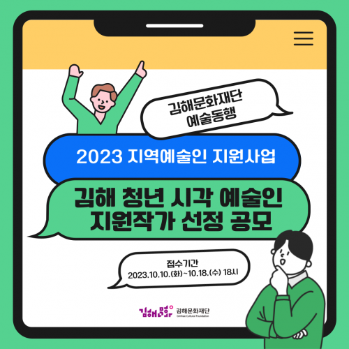 [½Åµ¿¾Æ¹æ¼Û´º½º=ÃÖ¼ÛÈ­±âÀÚ] (Àç)±èÇØ¹®È­Àç´ÜÀÌ ±èÇØ û³â ½Ã°¢¿¹¼úÀÎÀ» Áö¿øÇÏ´Â °ø¸ð¸¦ °³ÃÖÇÕ´Ï´Ù. À̹ø °ø¸ð´Â ±èÇØ¹®È­Àç´ÜÀÌ Áö¿ª¹®È­¿¹¼ú ÁøÈïÀ» À§ÇØ ¹Î‧°ü ÇÕµ¿À¸·Î ¿î¿µÇÏ´Â ÈÄ¿øÈ¸ ¡¸¿¹¼úµ¿ÇࡹÀÇ ¡®2023 Áö¿ª¿¹¼úÀÎ Áö¿ø»ç¾÷¡¯ÀÇ ÀÏȯÀ¸·Î ±âȹ¡¦