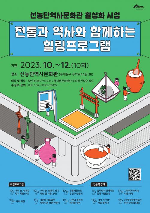 µ¿´ë¹®¹®È­Àç´Ü(´ëÇ¥ÀÌ»ç ±è°æ¿í)Àº ¼±³ó´Ü¿ª»ç¹®È­°ü Ȱ¼ºÈ­¸¦ À§ÇØ 10¿ùºÎÅÍ 12¿ù±îÁö ¡®ÀüÅë°ú ¿ª»ç¿Í ÇÔ²²ÇÏ´Â Èú¸µ ÇÁ·Î±×·¥¡¯À» ¿î¿µÇÑ´Ù. ÃÑ 10ȸ·Î ÁøÇàµÇ´Â º» ÇÁ·Î±×·¥Àº ¼±³ó´Ü¿ª»ç¹®È­°ü¿¡¼­ ¹«·á·Î ÁøÇàµÇ¸ç ¼±³ó´Ü°ú ¼±³ó´ëÁ¦¿¡ ´ëÇØ ¹è¿ì¸ç ÀüÅ빮ȭµµ¡¦