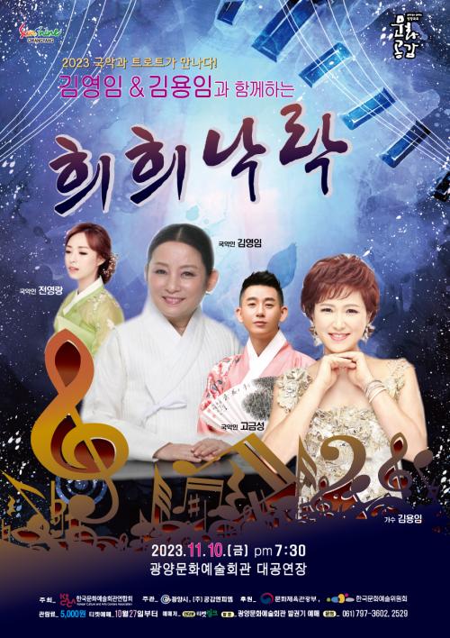 [½Åµ¿¾Æ¹æ¼Û=¹Ú±¤¿Á±âÀÚ] ±¤¾ç½Ã´Â ³»´Þ 10ÀÏ(±Ý) Àú³á 7½Ã 30ºÐ ¹®È­¿¹¼úȸ°ü ´ë°ø¿¬Àå¿¡¼­ ¡®2023 ±¹¾Ç°ú Æ®·ÎÆ®°¡ ¸¸³ª´Ù! ±è¿µÀÓ & ±è¿ëÀÓ°ú ÇÔ²²ÇÏ´Â ÈñÈñ³«¶ô¡¯ °ø¿¬À» °³ÃÖÇÑ´Ù. À̹ø °ø¿¬Àº Çѱ¹¹®È­¿¹¼úȸ°ü¿¬ÇÕȸ ÁÖÃÖ, ±¤¾ç½Ã ÁÖ°ü, ¹®È­Ã¼À°°ü±¤ºÎ¿Í ÇÑ¡¦