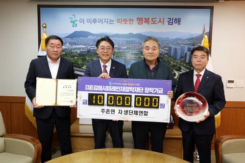 [½Åµ¿¾Æ¹æ¼Û´º½º=ÃÖ¼ÛÈ­±âÀÚ] ±èÇØ½Ã¹Ì·¡ÀÎÀçÀåÇÐÀç´Ü(ÀÌ»çÀå ÇöÁ¾¿ø)Àº ÁÖÃ̸é ÀÚ»ý´Üü¿¡¼­ ÀåÇбâ±Ý 1,000¸¸¿øÀ» ±âºÎÇß´Ù°í 2ÀÏ ¹àÇû´Ù. ÀåÇбâ±ÝÀº ÁÖÃ̸é ÁÖ¹ÎÀÚġȸ(ȸÀå ÇѹüÈñ), ÀÌÀå´ÜÇùÀÇȸ(ȸÀå ±èÁ¾½Â), ¹ßÀüÇùÀÇȸ(ȸÀå ±èÀ籤) µî 7°³ ÀÚ»ý´Üü¿¡¼­ ¡¦