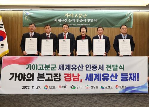 [½Åµ¿¾Æ¹æ¼Û ÇÔ¾È=À̽ŵ¿±âÀÚ]ÇԾȱºÀº 27ÀÏ ¿ÀÀü 11½Ã ¼­¿ï ÄÚ¸®¾Æ³ªÈ£ÅÚ¿¡¼­ ¿­¸° °¡¾ß°íºÐ±º ¼¼°èÀ¯»ê µîÀç ÀÎÁõ¼­ Àü´Þ½Ä¿¡¼­ ¹®È­ÀçûÀ¸·ÎºÎÅÍ °¡¾ß°íºÐ±º ¼¼°èÀ¯»ê ÀÎÁõ¼­¸¦ Àü´Þ¹Þ¾Ò´Ù. À̹ø ÀÎÁõ¼­ Àü´Þ½ÄÀº Áö³­ 9¿ù ÇÔ¾È ¸»ÀÌ»ê°íºÐ±ºÀ» ºñ·ÔÇÑ 7°³ °¡¾ß¡¦